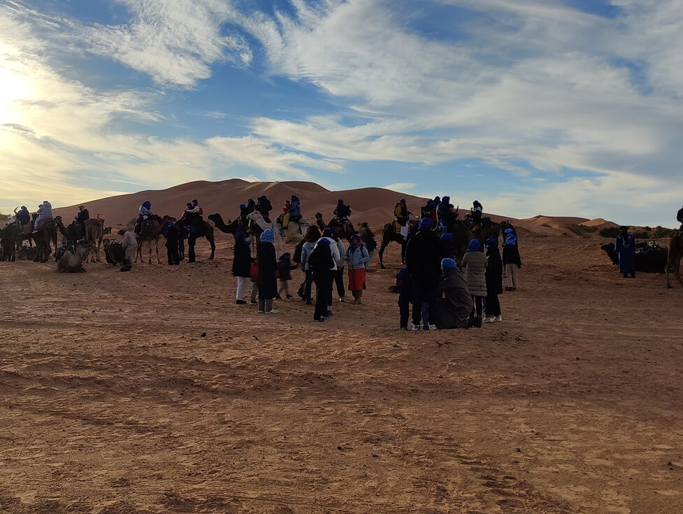 Today after breakfast we will keep navigating to the south, again through valleys and mountains of the high Atlas, in Ziz valley we are invited for a lunch in a nice place and later a walk of one hour in the fields, a cup of tea with local family, than drive to the next city, Erfoud the town of fossils and dates, there we visit a fossil polisher, before we head to the last destination, Merzouga. One hour before sunset starts the experience of exploring Sahara sand and enjoying a spectacular sunset, you will start riding a camels. Overnight in Camp, with a Berber local dinner and music around the fire place, while watching stars.
